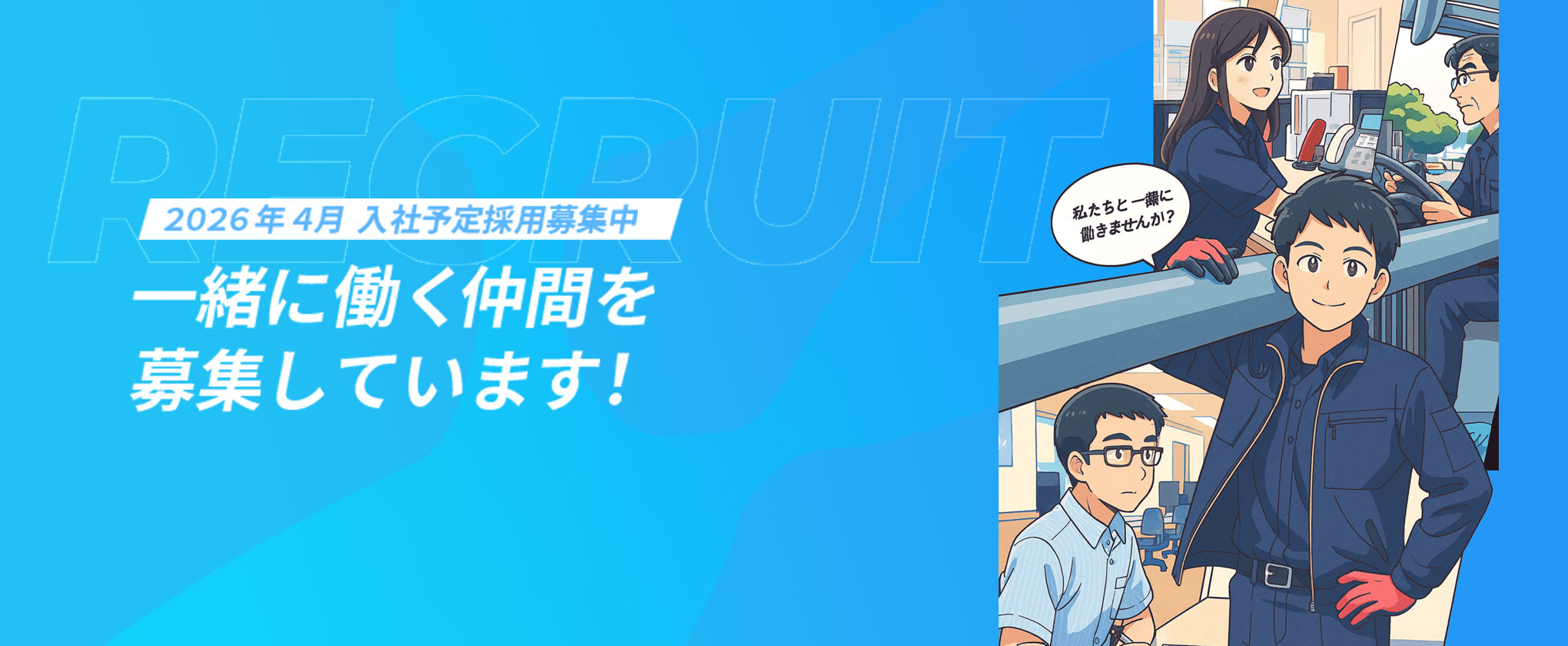 水の供給や排水に関する、人間生活に欠かせないインフラを支えるのが私たちの仕事です。 やりがいがあり、使命感のある仕事です。ぜひ一緒に福岡の水インフラを支えましょう。 あなたの応募を待っています!